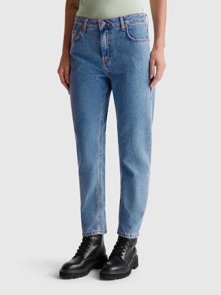 Mom Fit lange Hose aus recyceltem Baumwoll-Denim. Fünf-Taschen-Design mit Reißverschluss und Knopf. Dieses Kleidungsstück besteht aus mindestens 20 % RCS-zertifizierter recycelter Baumwolle. Zertifiziert nach ICEA – ICEA – TX – 611. Produkte, die nach dem Recycled Claim Standard (RCS) zertifiziert sind, enthalten recycelte Materialien, die in jeder Phase der Lieferkette, vom Recycler bis zum fertigen Produkt, unabhängig überprüft wurden.